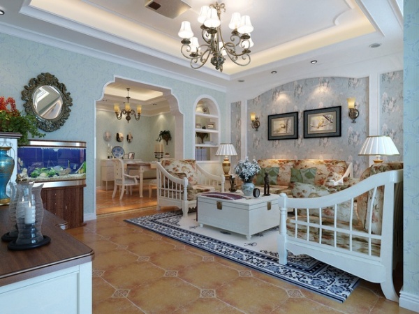 在歐式田園風格的室內(nèi)裝修裝飾中,地面材質(zhì)多為天然石材或木地板,客廳中常用家具和軟裝飾共同營造浪漫的整體效果,尤其是深色的橡木或楓木家具,配以色彩鮮艷的布藝沙發(fā),是一大特色。更為浪漫的是,歐式田園風格家庭裝修裝飾、別墅裝修裝飾等家裝中常配以羅馬簾、精美的油畫、精良的雕塑工藝品等,不過需注意的是,浪漫設計在面積較大的空間中會表現(xiàn)的十分壯觀,而如果是小戶型的歐式田園風格卻難以彰顯得淋漓盡致。