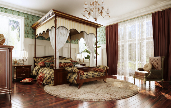 古典歐式風(fēng)格的臥室,超強的奢華感充斥著整間房間,造型別致古樸的吊燈,霸氣高雅的歐式床幔設(shè)計,基色黃色黑色花紋的床上用品和紅色保證,盡顯貴氣,加之床邊的床尾凳,又為這間臥室增添了不少高貴的氣度。深棕色的實木地板,色澤純正,表面光滑有質(zhì)感。古典歐式風(fēng)格,追求空間上的連續(xù)性,整件臥室,從上至下,無論是床幔支架的顏色,還是窗簾的顏色,亦或是家具和地板的顏色,整體色彩的連接都非常恰當(dāng)好處,和地板近乎同樣色系的木質(zhì)家居,造型簡潔卻很精致,線條簡明卻很大氣,與質(zhì)地獨特,腳感舒適度十足的地毯搭配的相得益彰。