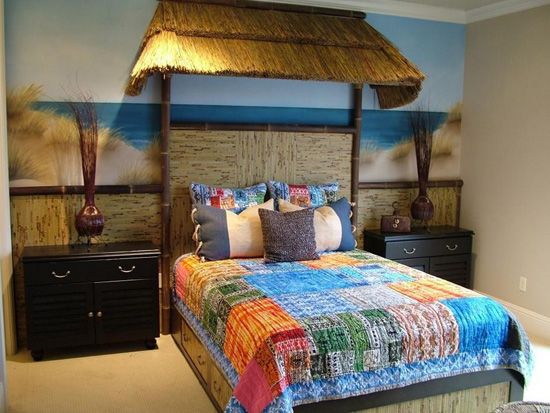 布藝是東南亞風(fēng)格特色中的一大重要元素,色調(diào)較深的家居主色調(diào)和家具,會給人單調(diào)、沉悶的感覺,多彩的布藝飾品是打破這種氣氛的最佳選擇。色彩的搭配不必過于復(fù)雜,對于家中是深色家具來說,可與之搭配的布藝顏色要以鮮艷為主,比如大紅色、鵝黃色等;如果家中的家具淺色的較多,布藝的顏色要么貼近家具的顏色,要么與之形成對比,在連續(xù)性的空間中多出那么一些跳躍性的色彩,搭配出的效果是比較有新意的。對于有宗教信仰的人來說,家中也會常見到一些面具、羊皮制品及木雕等等,突出了民族風(fēng)情的獨(dú)特。
