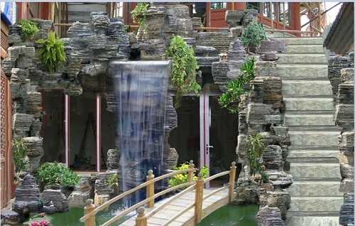 用山石做卷邊處理,雖然不太符合自然物象,但是只有這樣才能確保瀑布沿著墻體、山體比較平穩(wěn)地滑落下來,并且最好再作坡面處理。在進(jìn)行瀑布的設(shè)計和建造中,還必須事先確定好瀑布的水量,這樣更有助于讓瀑布產(chǎn)生最佳的視覺、聽覺效應(yīng),因?yàn)樗看舐洳畲,水聲更響,氣勢更壯觀,而如果是水量小,落差大卻讓瀑布失去了真正的內(nèi)涵,難以激起人們的興致,反而會人們失落很多。