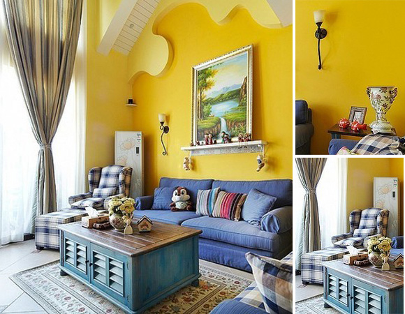 黃、藍紫和綠系列搭配體系是地中海風格辦公室裝修、賓館酒店裝修裝飾等工裝,和家庭辦公室、別墅裝修裝飾等家裝中色彩應(yīng)用率低于藍白色系列搭配的第二大奇特色彩應(yīng)用,是取自于南意大利向日葵、法國南部薰衣草花田中,金黃色、籃、紫花卉和綠葉相映襯,頗具情調(diào)的色彩組合,所以是又一大自然色彩組合成的地中海風格室內(nèi)裝修裝飾色彩應(yīng)用景觀。